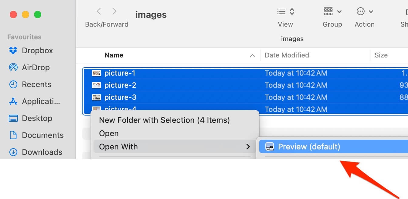Open the Converted Files in Preview: Select all the converted images, right-click, and choose Open With > Preview.