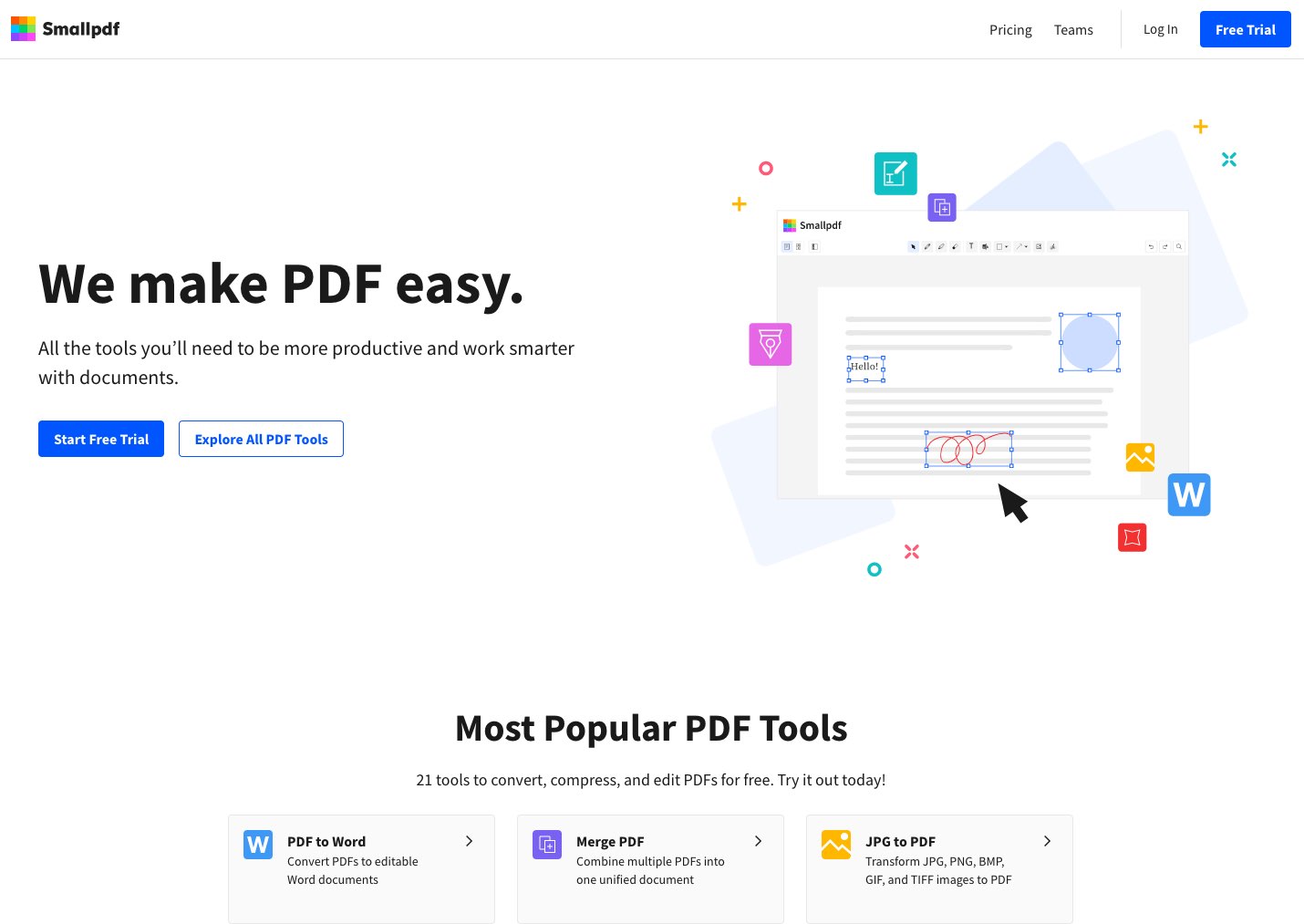 SmallPDF allows you to convert PDF to Word, Excel, PPT, and JPG. And you can also convert Word, Excel, PPT, and JPG back to PDF format.